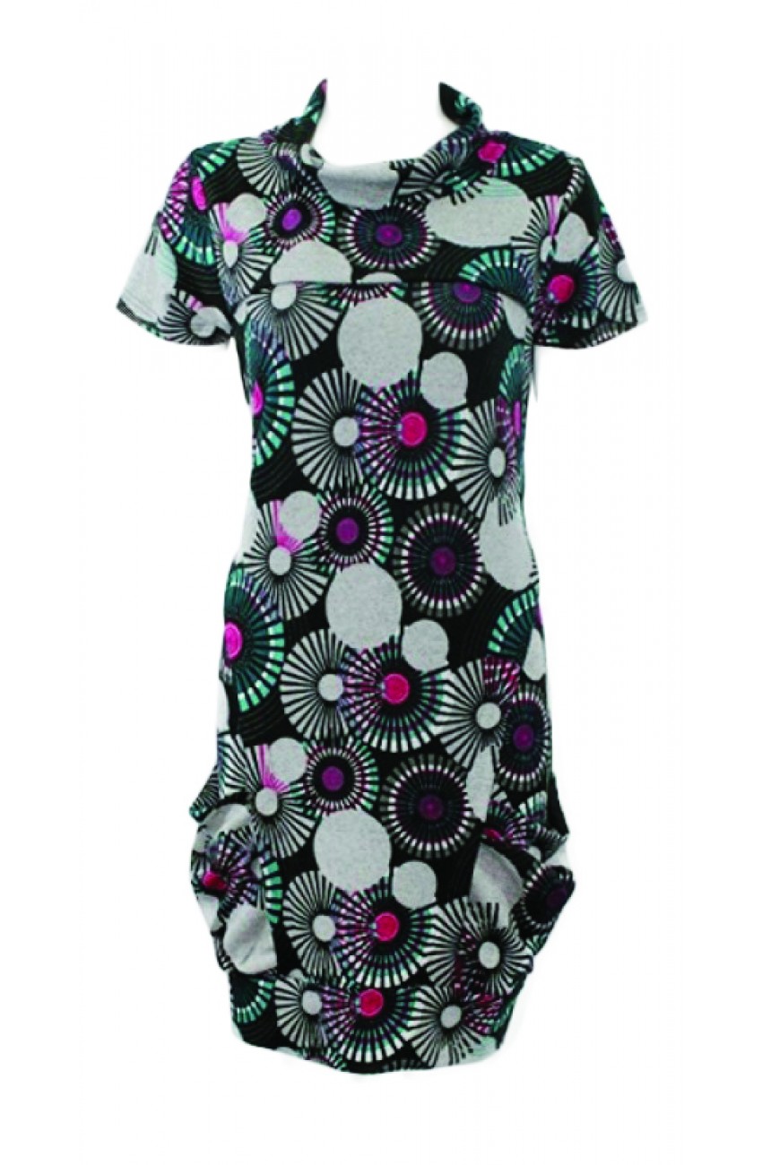 Features: | Short Sleeves High Neck line Bubble fitting style Two side pockets Elasticated back design Multi coloured little spiral print all over |